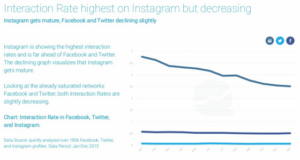 3. Tout réseau social confondu, les comptes avec une petite communauté (1-1k fans) obtiennent le meilleur taux d’engagement. Le taux d’interaction est nettement supérieur sur Instagram même si celui-ci diminue reflétant une maturité croissante.